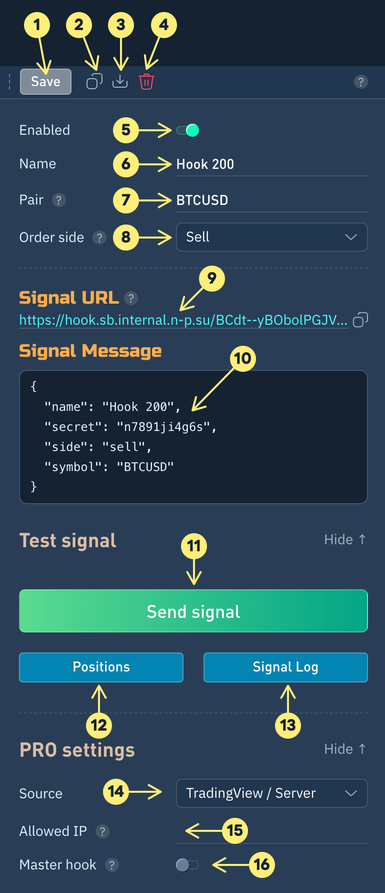 Allowed IP. By default, signals are only accepted from TradingView servers. If you are setting up signal reception from your server, you need to add its IP address. If you specify 0.0.0.0/0, IP restrictions will be removed, but we do not recommend using this permanently, only for testing, as it reduces the security of your trading.