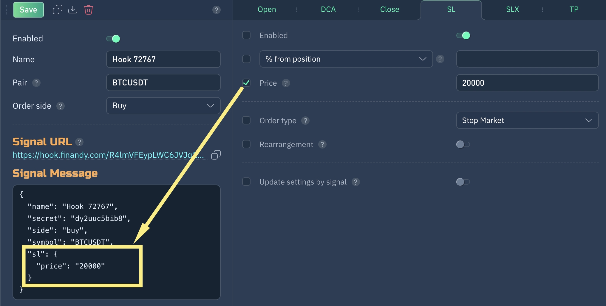 To include this setting in the message code and transmit price by signal, check the box to the left. Read more->