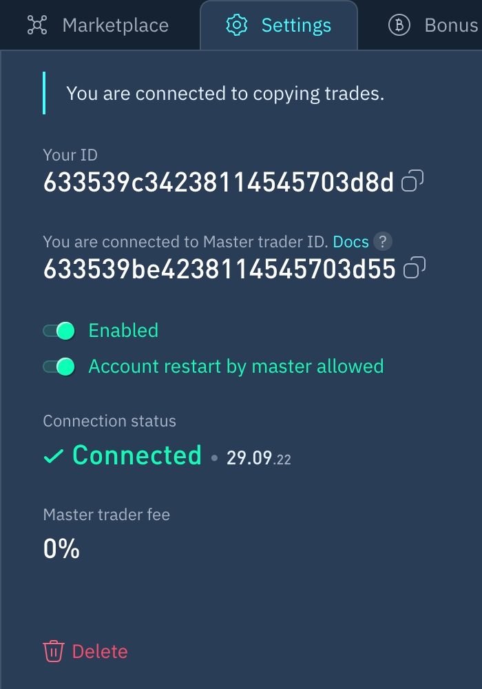 You can disconnect from the master trader at any time by clicking the Delete icon