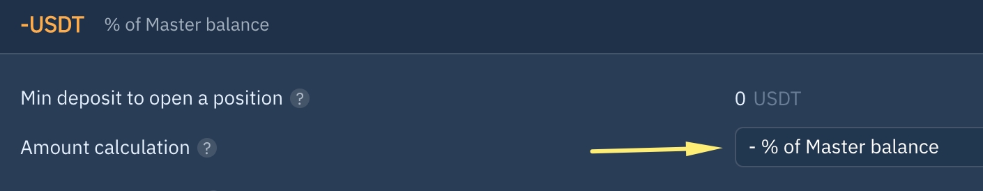 When the Master creates an order, the percentage of the Master's total account balance is calculated using the following formula % = order amount / master balance x 100