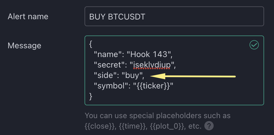 Si desea que la señal sea de compra, cambie manualmente el mensaje de la señal a "side": "buy" en la configuración de señales de Tradingview.