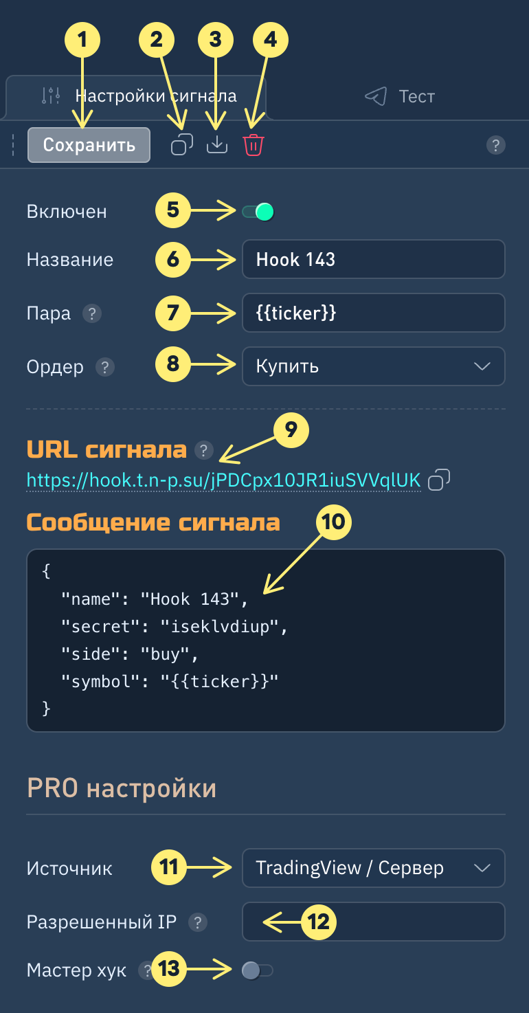 IP permitida. Por defecto, las señales sólo se reciben de los servidores TradingView. Si está configurando para recibir señales de su propio servidor, tendrá que añadir su dirección IP. Especificar 0.0.0.0/0 elimina la restricción de IP, pero no recomendamos que se utilice de forma permanente, sino sólo durante las pruebas, ya que reduce la seguridad de sus operaciones.