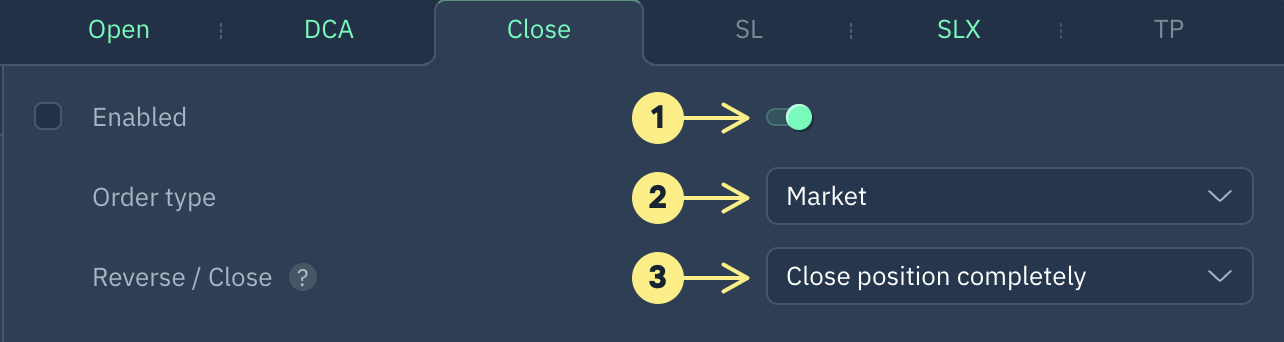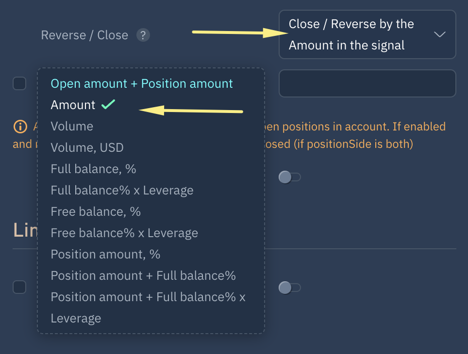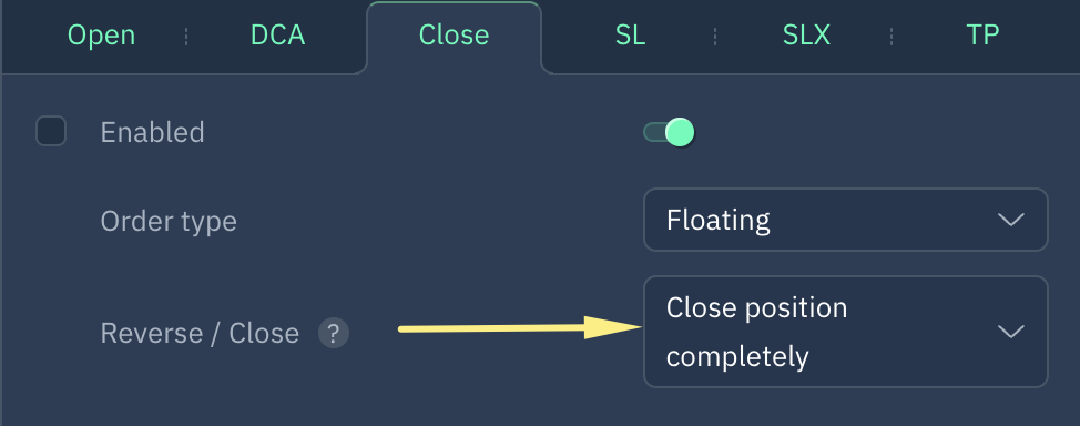 Selecciona "**Cerrar/reversa por cantidad en la señal**".