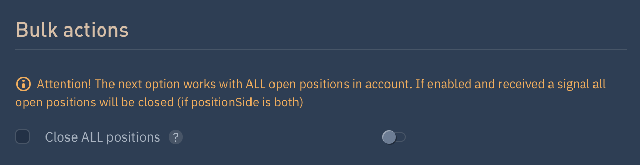 Si se envía una señal con "`positionSide": "flat`", se cerrarán todas las posiciones en el par dado en el mercado dado. Por ejemplo: