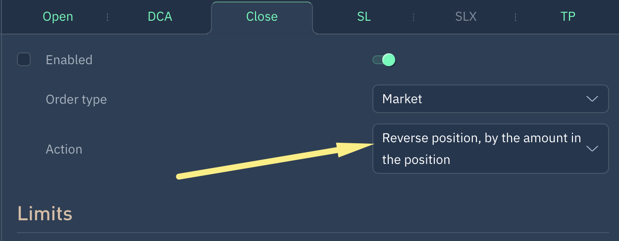 Cuando llegue la señal, se creará una orden de reversa= **2x** de la posición actual. Es decir, se cerrará la posición actual y se abrirá una nueva posición con el mismo importe.