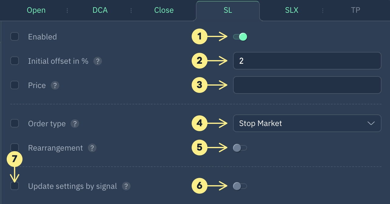 Si se especifican tanto el % como el precio exacto, este último tiene prioridad. Es decir, el SL se fijará al precio especificado y no se calculará a partir del desplazamiento %.
