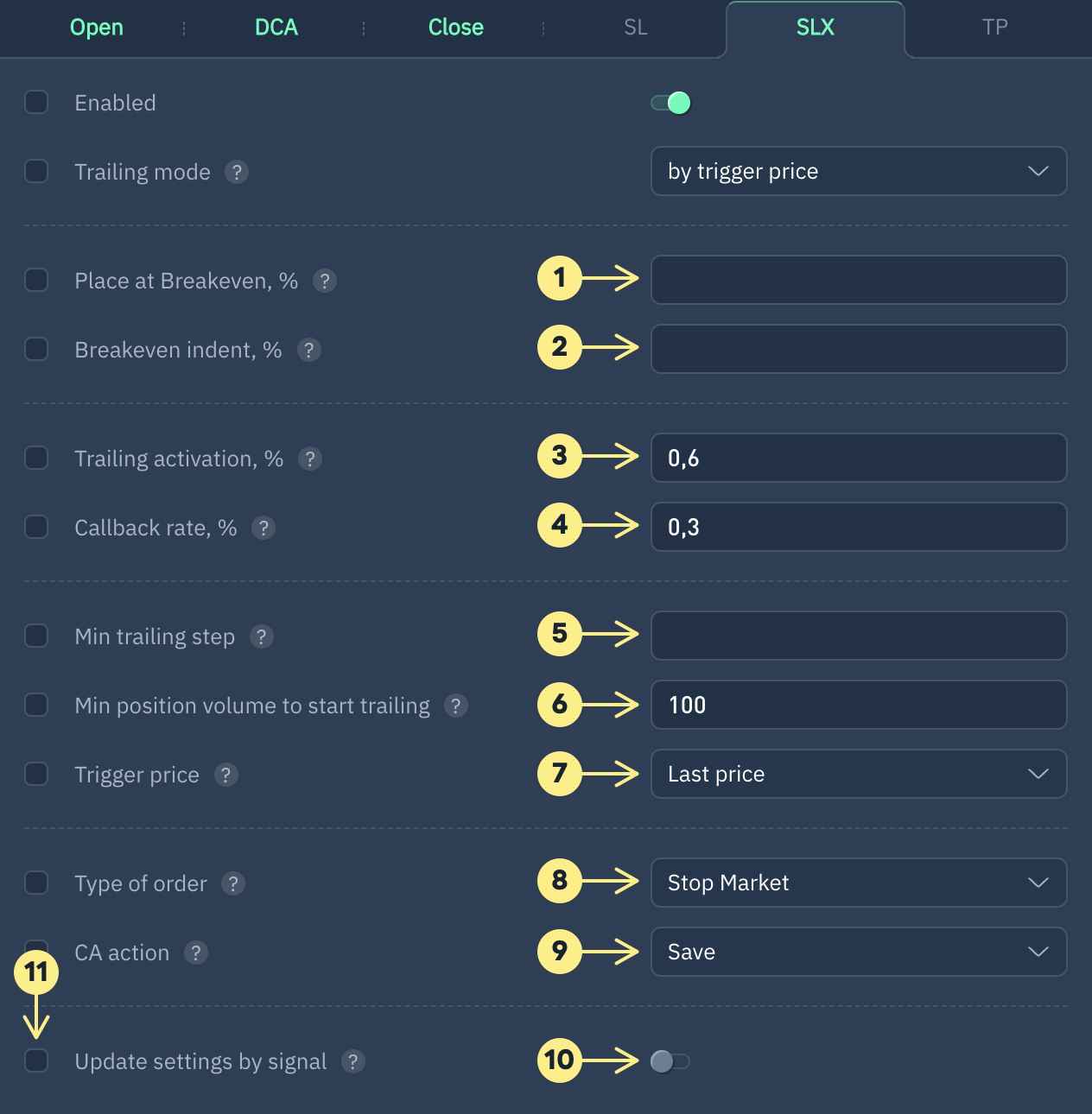 Si el campo está vacío, SLX colocará una orden SL al precio del break-even cuando se active el trigger del paso 1.
