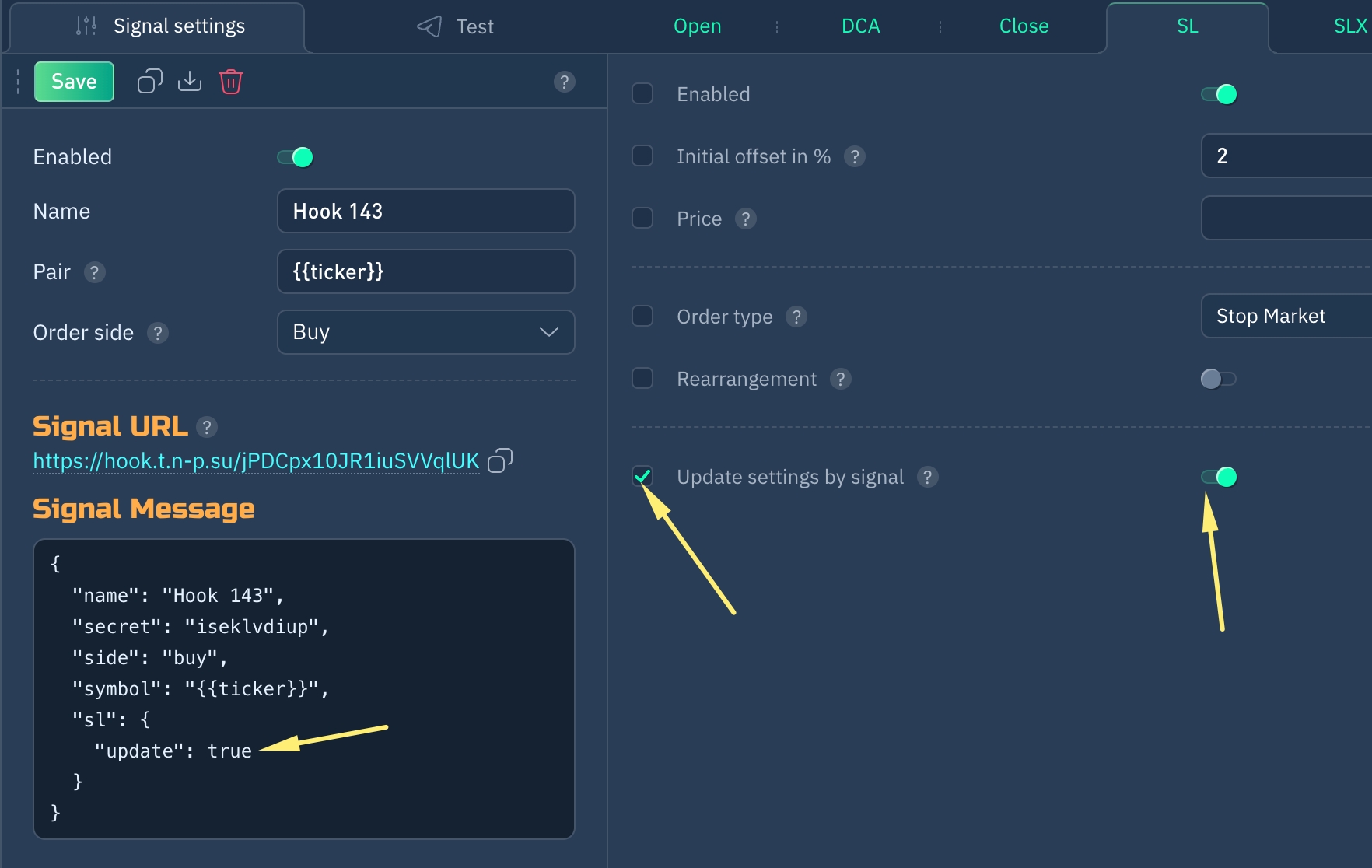 Si es necesario actualizar los ajustes del módulo en una posición abierta, envíe una señal que contenga "update": true en los parámetros del módulo del mensaje de señal.