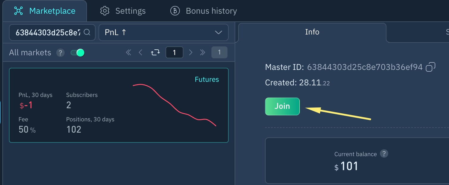 Si tienes el ID del Master del que quieres copiar operaciones, puedes conectarte para copiar sus operaciones desde la página de configuración.