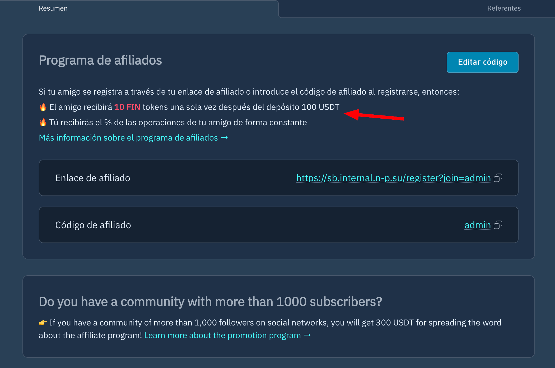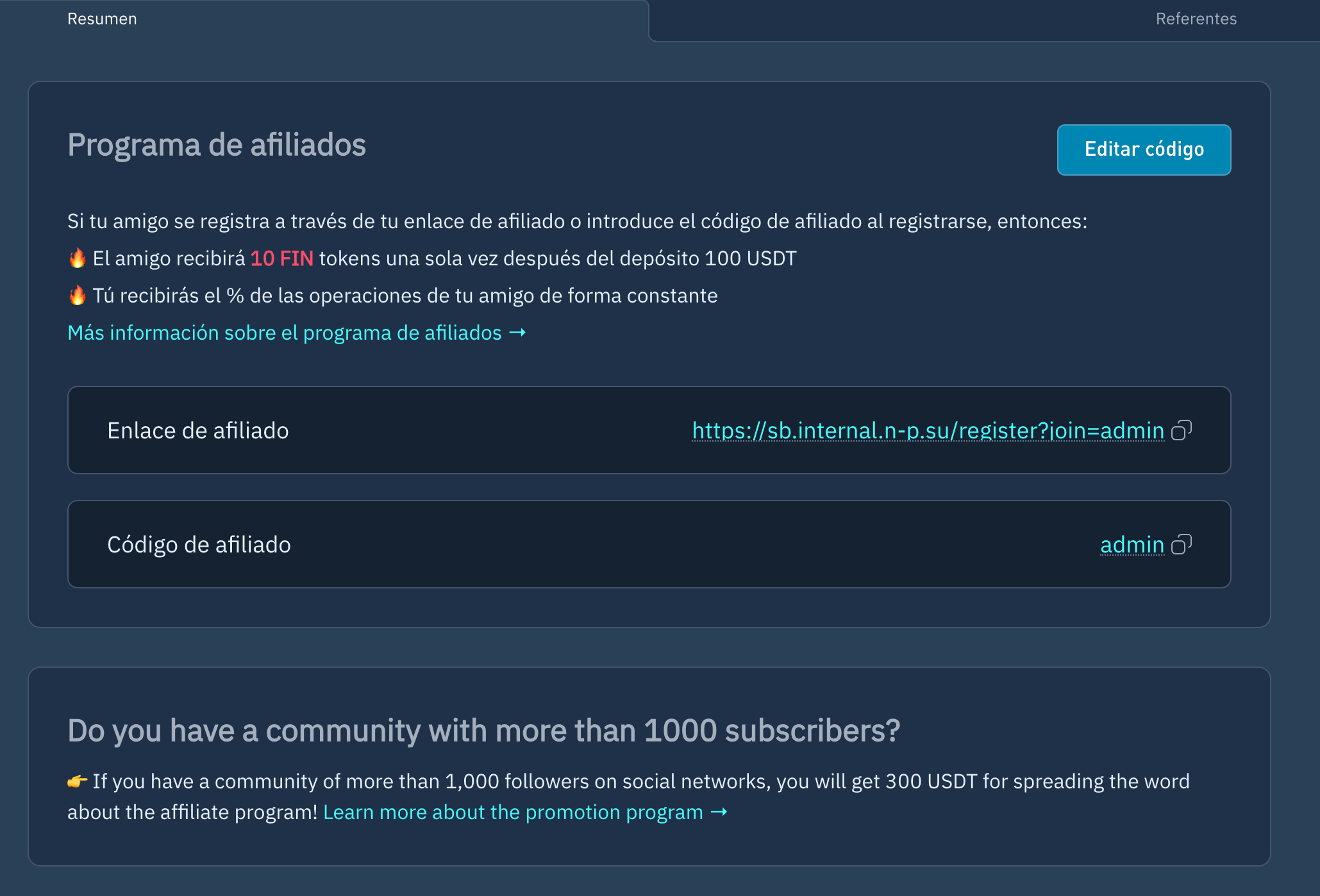 Comparte un enlace de referido o un código promocional con tu audiencia y consigue USDT + la criptomoneda FIN.
