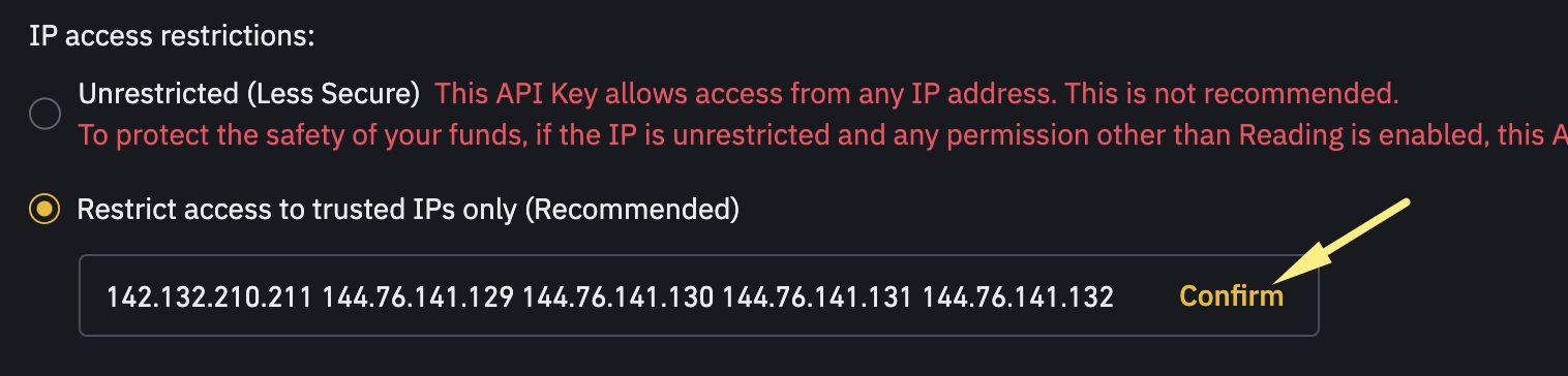 10. Activar la Lista Blanca IP , pegar la lista copiada en Finandy y pulsar "Confirmar".