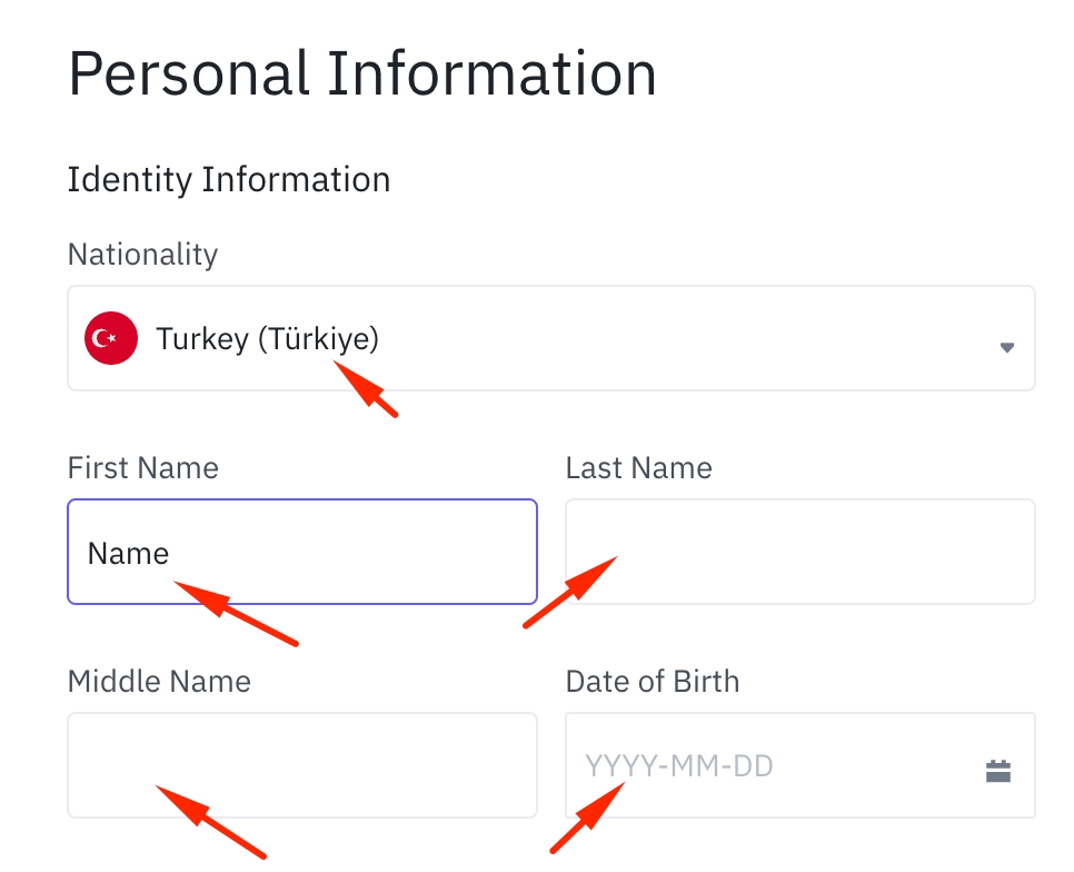 Elija su nacionalidad y rellene el nombre completo y la fecha de nacimiento.