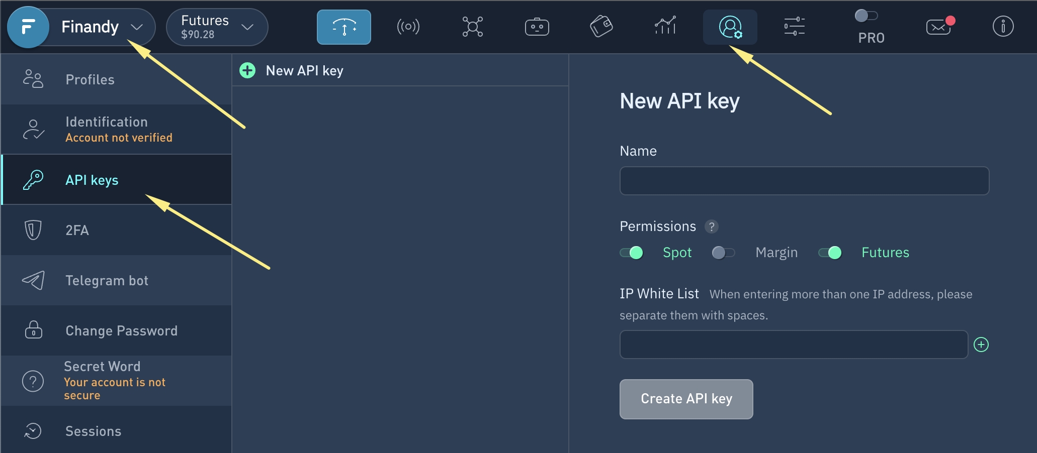 Seleccione Finandy Exchange en la parte superior derecha y la opción de menú Cuenta/Claves API.