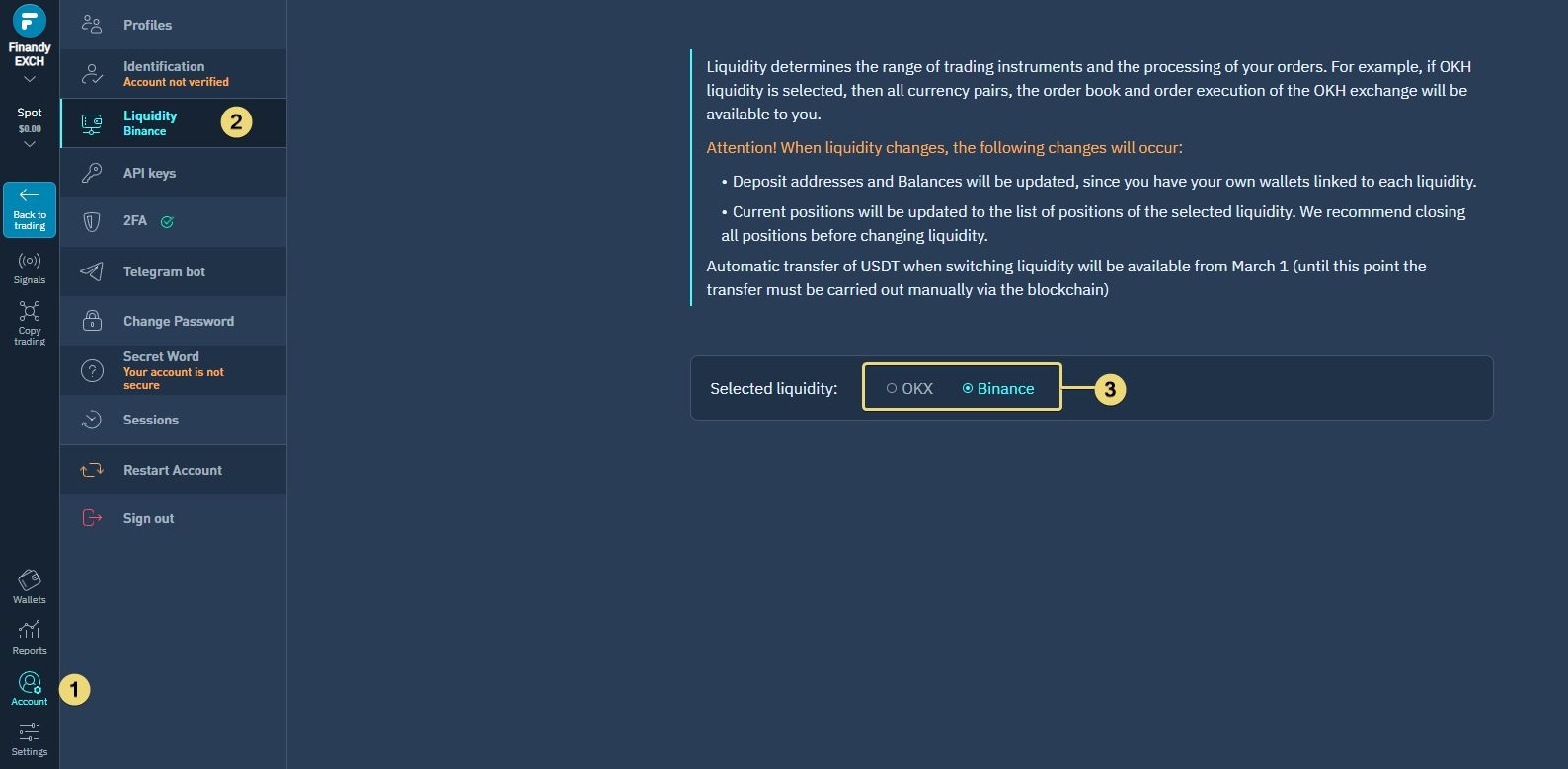 En Finandy Exchange, tienes la opción de elegir la liquidez. La liquidez determina la selección de instrumentos comerciales y el procesamiento de tus órdenes. Por ejemplo, si se elige la liquidez de OKX, tendrás acceso a todos los pares de divisas, el libro de órdenes y la ejecución de órdenes proporcionada por el Exchange OKX.