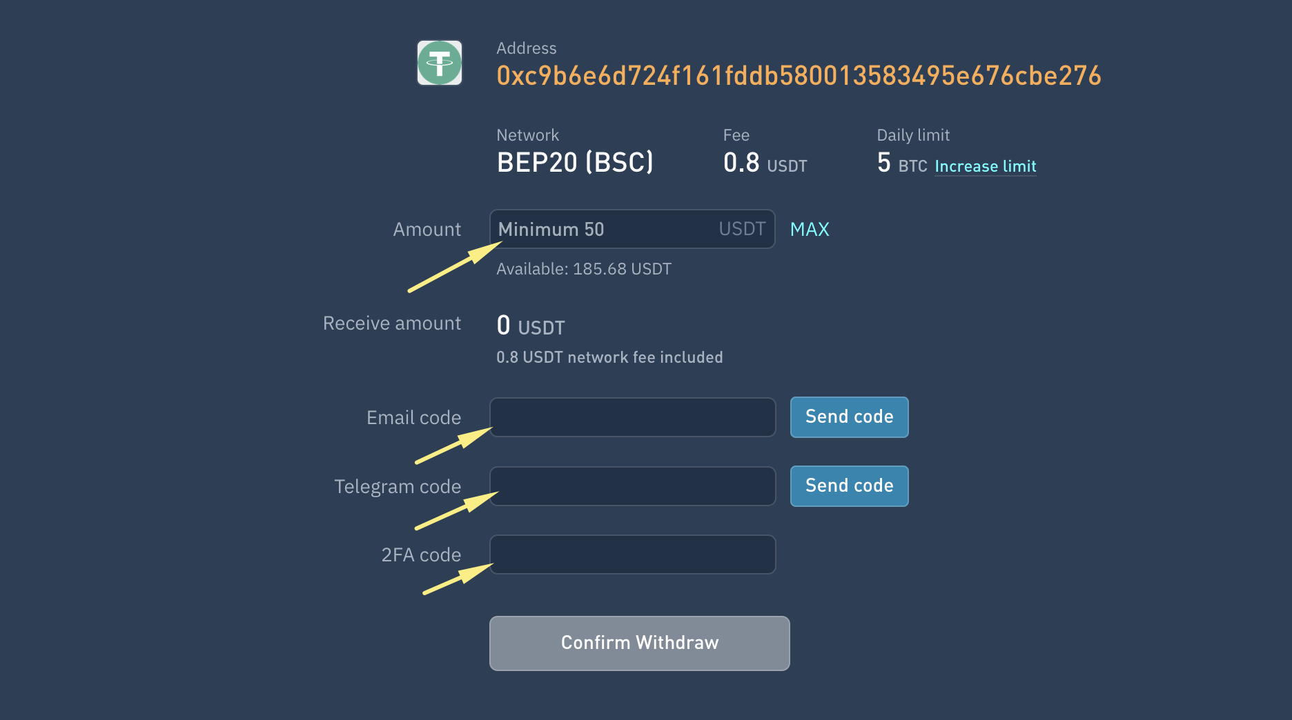 Los usuarios verificados por correo electrónico tienen un límite de retirada diario de <mark style="color:green;">**5 BTC.**</mark>