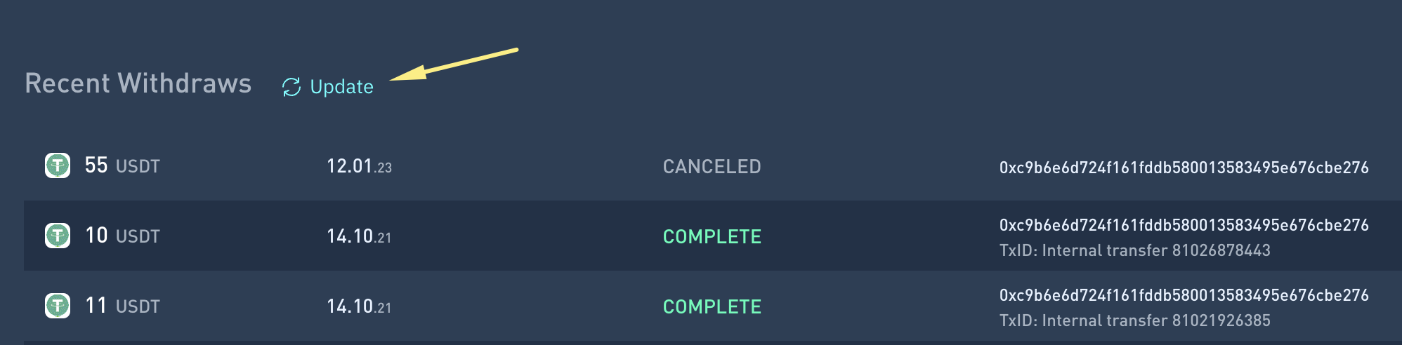 Puede comprobar el estado de los retiros en la sección "**Retiros recientes**" haciendo clic en el botón Actualizar.