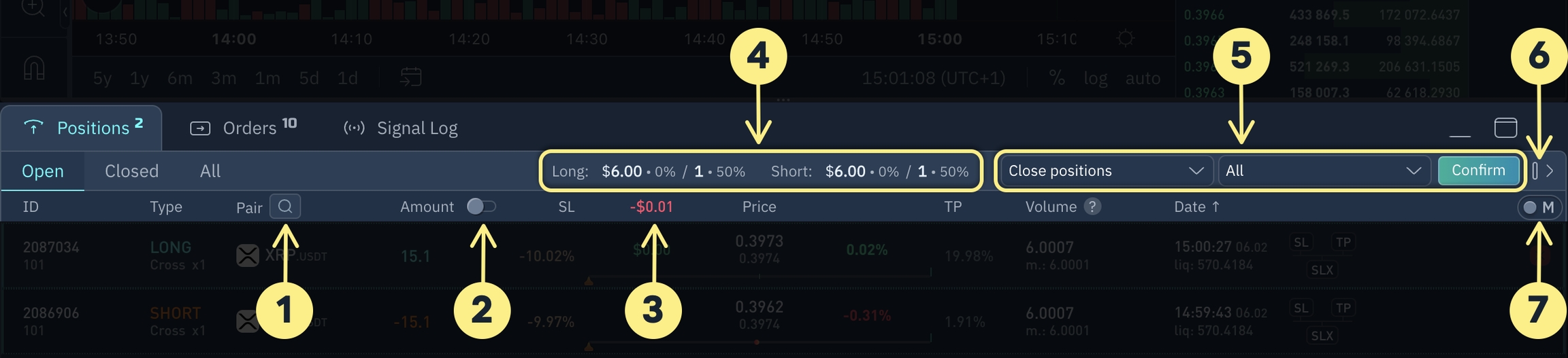 Si tiene activado el modo unidireccional en Futuros, aparecerá un botón de inversión de posición a la izquierda del botón de cierre de posición (elemento 2).