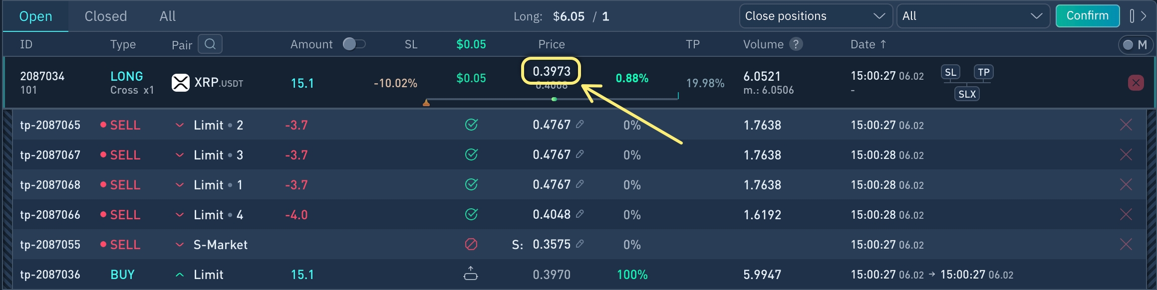 El precio de la posición incluye todas las comisiones de entrada y salida. Todos los precios take profit, average y stop loss se calculan a partir del nivel del precio de posición.