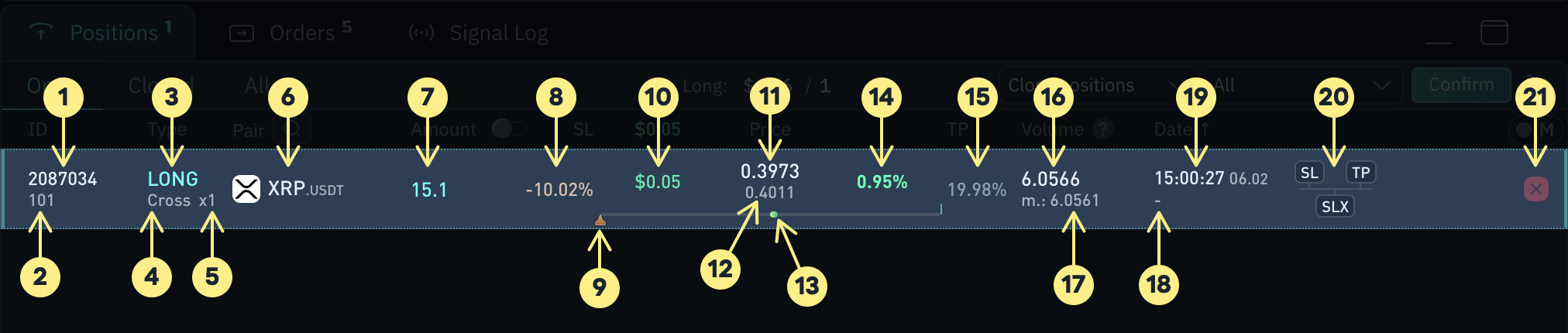 Si tiene activado el modo unidireccional en Futuros, aparecerá un botón de inversión de posición a la izquierda del botón de cierre de posición (elemento 21).