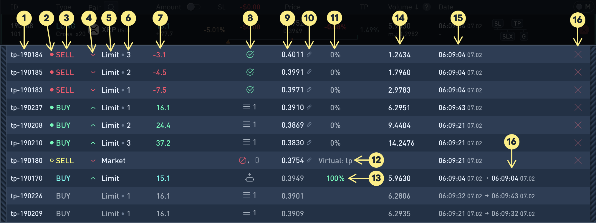 Indicador de que la orden es virtual. Los dos puntos indican un trigger: - ob (order book) - libro de órdenes - lp (last price) - precio actual - 1m, 5m etc. - trigger by candlestick with specified timeframe