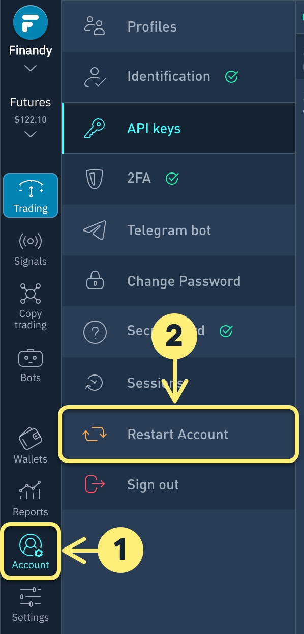 Es posible que tenga que reiniciar su cuenta si ésta no funciona con normalidad, por ejemplo, si el sistema genera un error y la orden no se coloca en el exchange.