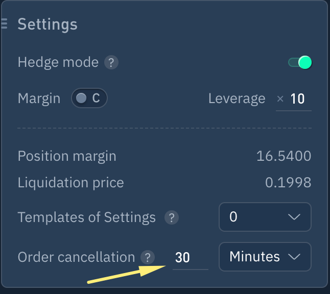 En el bloque de ajustes de posición, si introduce un tiempo de autocancelación, las órdenes se cancelarán automáticamente después del tiempo establecido. \