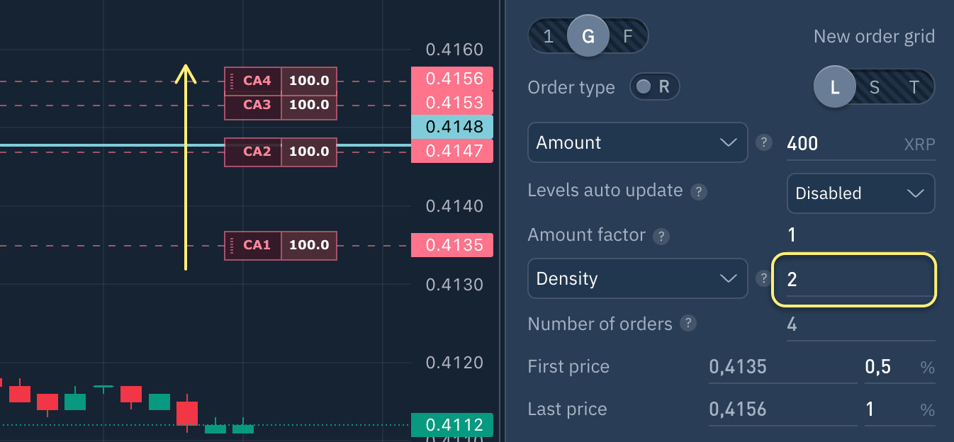 Si se selecciona "**Densidad**" igual a 1, las órdenes se distribuirán uniformemente en la rejilla, si es mayor que 1, las órdenes se concentrarán más cerca del final de la rejilla, si es menor que 1, estarán más cerca del principio.