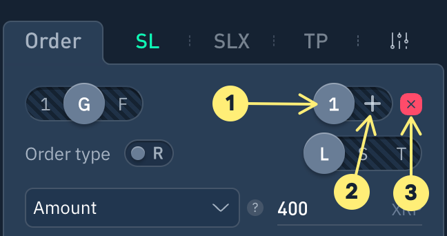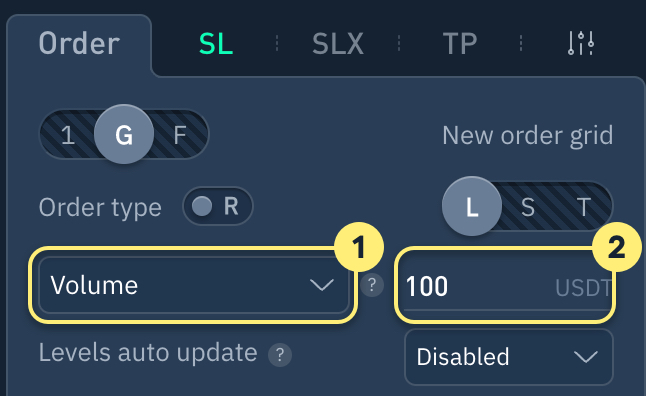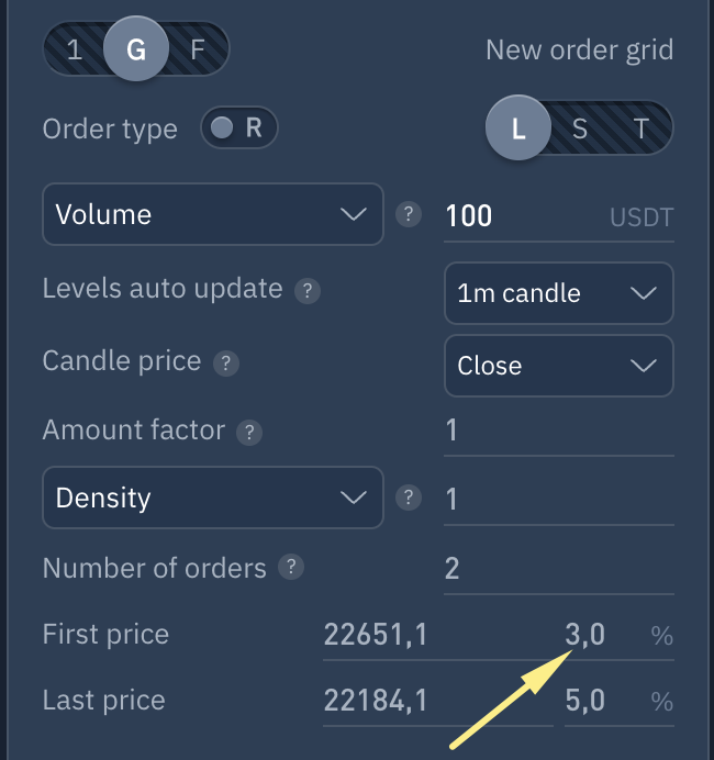 Para crear una cuadrícula de órdenes, seleccione el símbolo "G" en el formulario de creación de órdenes y defina los siguientes parámetros: