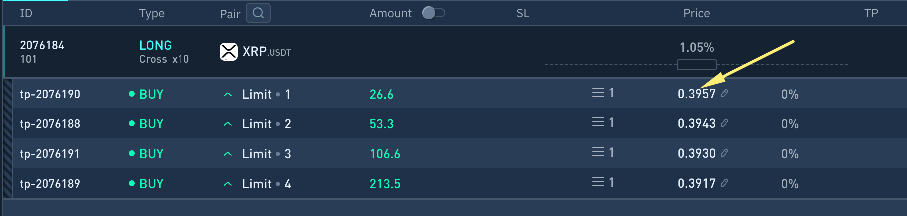 Por ejemplo, si establece el volumen total de el Grid = **100 USDT** y lo distribuye equitativamente en 4 órdenes, el volumen de cada orden será = **25 USDT**.