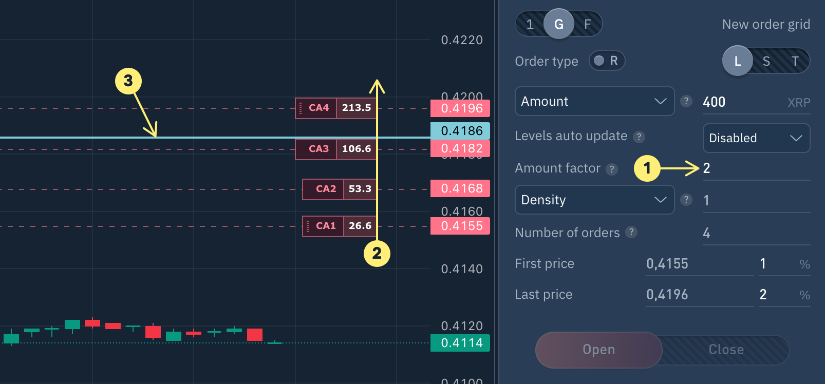 El número de órdenes reales más cercanas al precio actual se puede ajustar en la configuración el Grid de órdenes correspondiente.