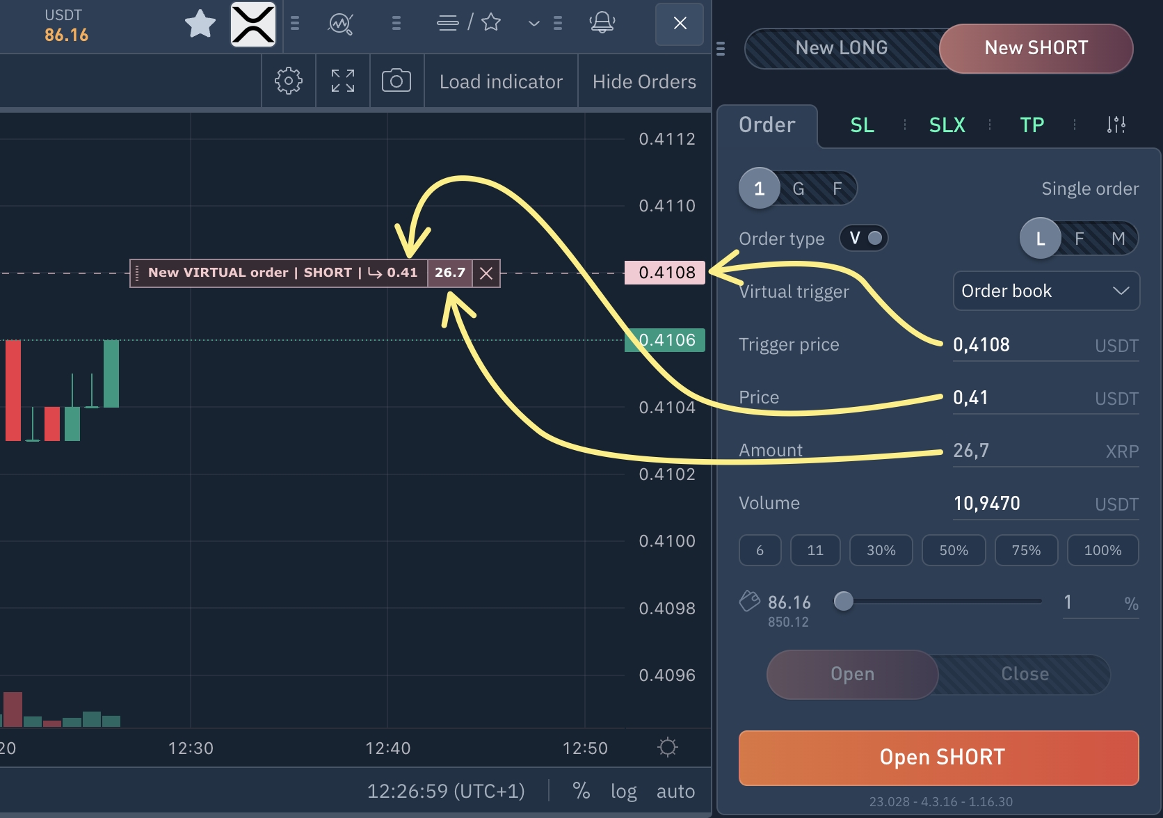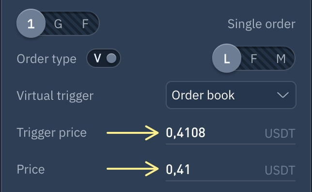 Esta configuración significa que cuando el precio llegue a 0,4108 se colocará una orden Límit a 0,41.