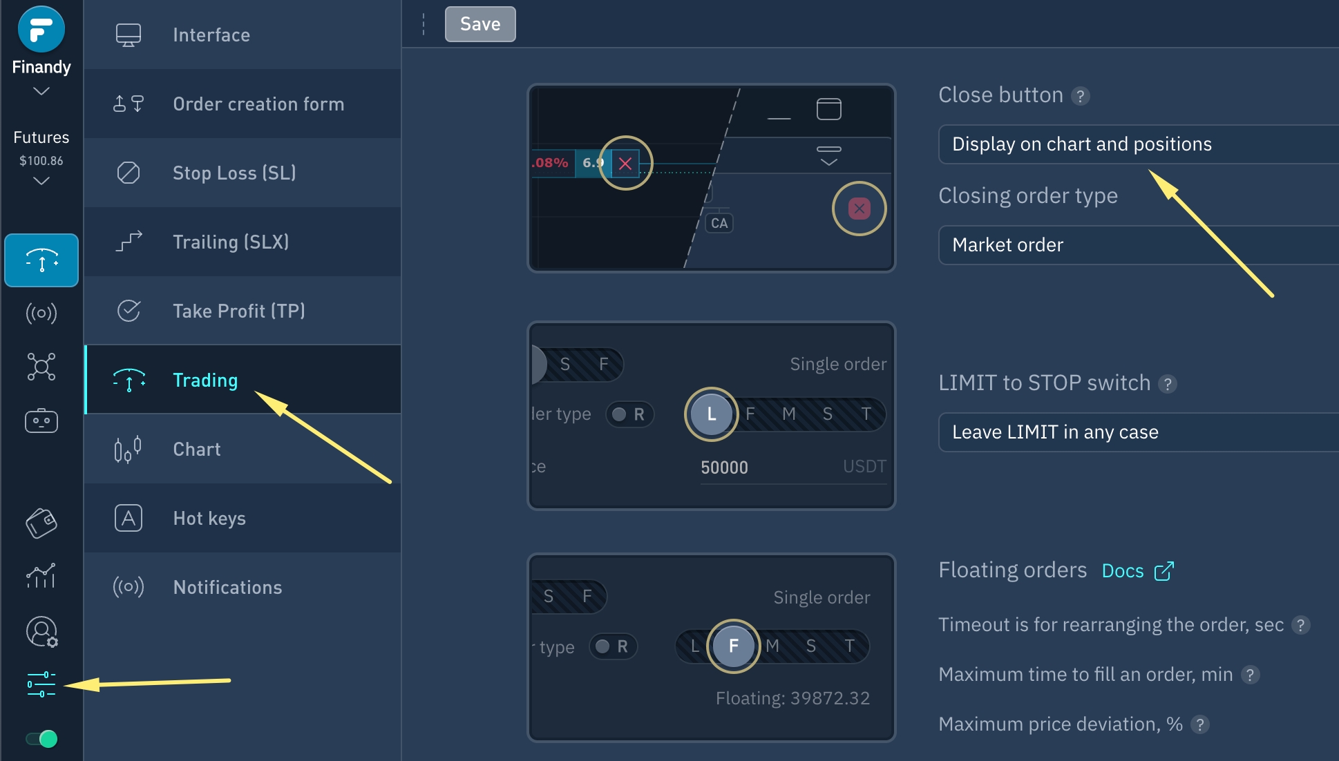Ocultar/Mostrar el botón de cierre de posición se controla en "Ajustes/Trading".