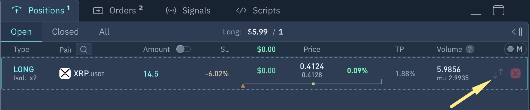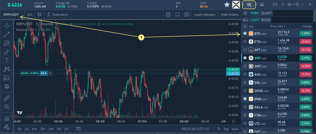 Abra el gráfico del par de divisas en cuya posición desea añadir tokens a la posición (precio promedio de la posición). También puede abrir un gráfico haciendo clic en el nombre del par de divisas en la línea de posición abierta.