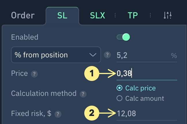 o viceversa, para un determinado importe de pérdida (1) se calcula el precio de stop loss (2):