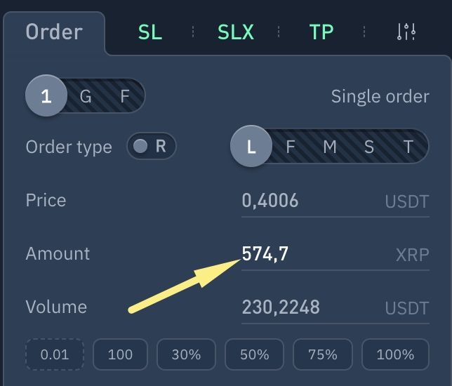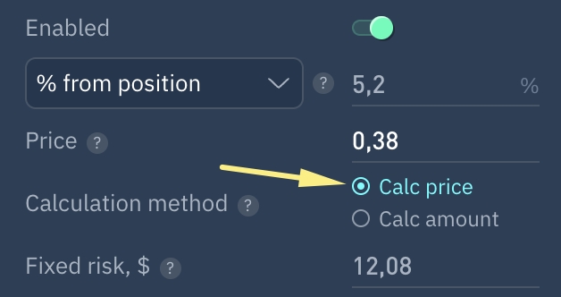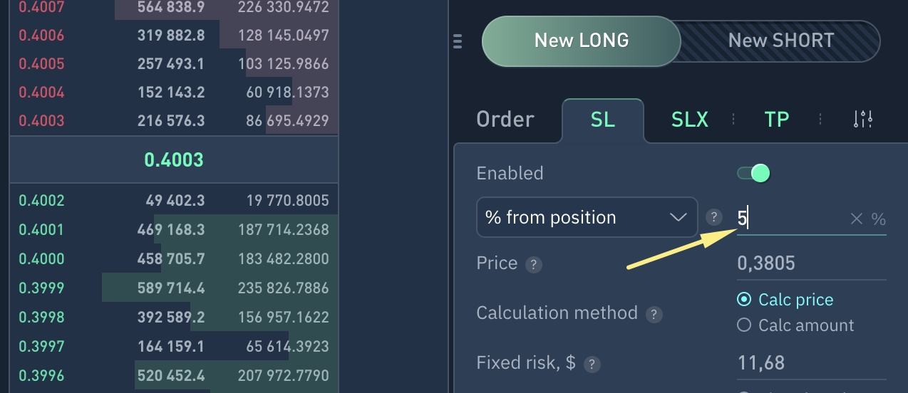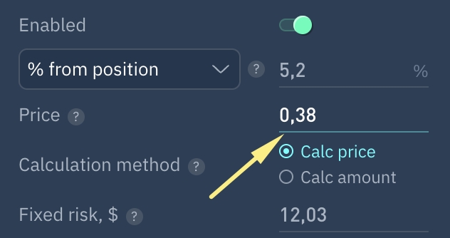 Por ejemplo, se fija un 5% del precio de la Long posición y si la primera orden se ejecuta a 0,4 (comisiones incluidas), la orden SL se colocará a 0,38.