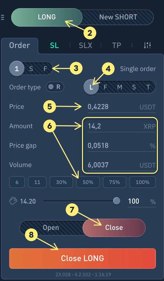 6. Introduzca la cantidad o el volumen de la orden como % de toda la posición