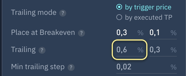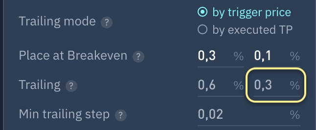 El porcentaje de beneficio (del precio de la posición al precio actual) del precio de la posición al que se activará el SL Trailing. Si la posición tenía previamente activado el módulo SL, se desactivará.