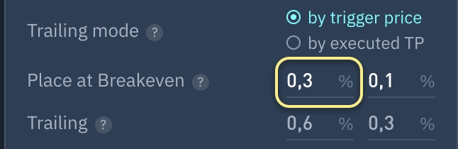 Puede establecer el % en el que el Stop Loss se desplaza del precio de equilibrio. Esto le permite obtener más beneficios si la posición se cierra en Stop Loss.