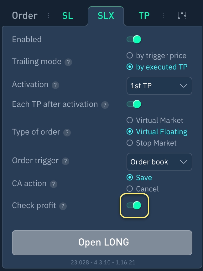 Si se activa, el módulo SLX moverá la orden SL sólo cuando haya beneficios en la posición. Si se desactiva, el módulo SLX moverá las órdenes SL independientemente de las ganancias o pérdidas.