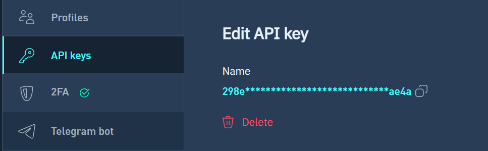 To delete an exchange API key, go to Account / API Keys (1) in Finandy's website and click on Delete (2).