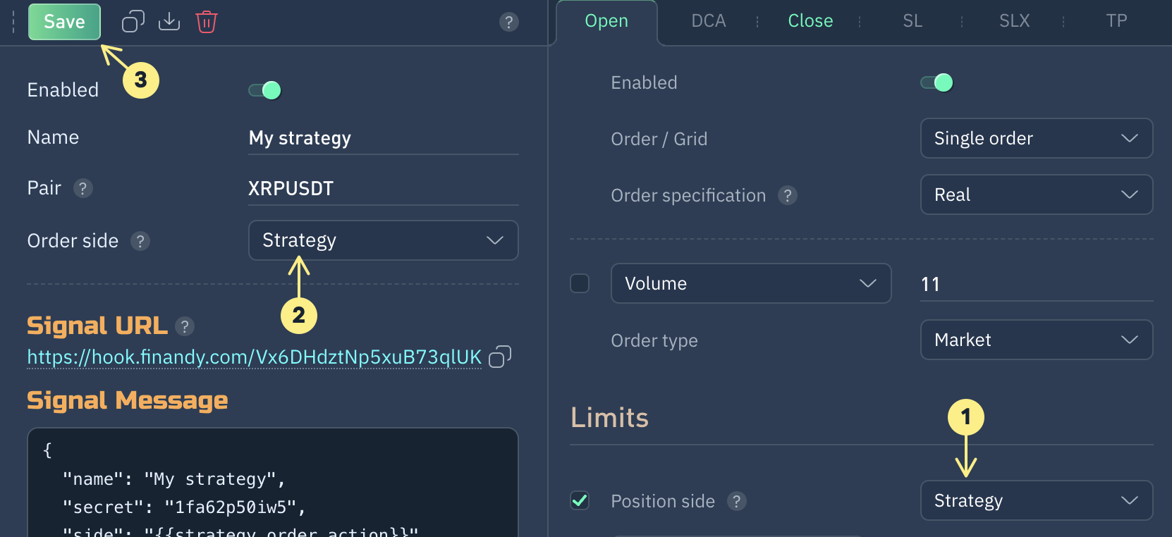 Установите  "**Позиция: Стратегия**" (1) и "**Ордер: Стратегия**" (2), как показано на рисунке и **Сохраните** (3).