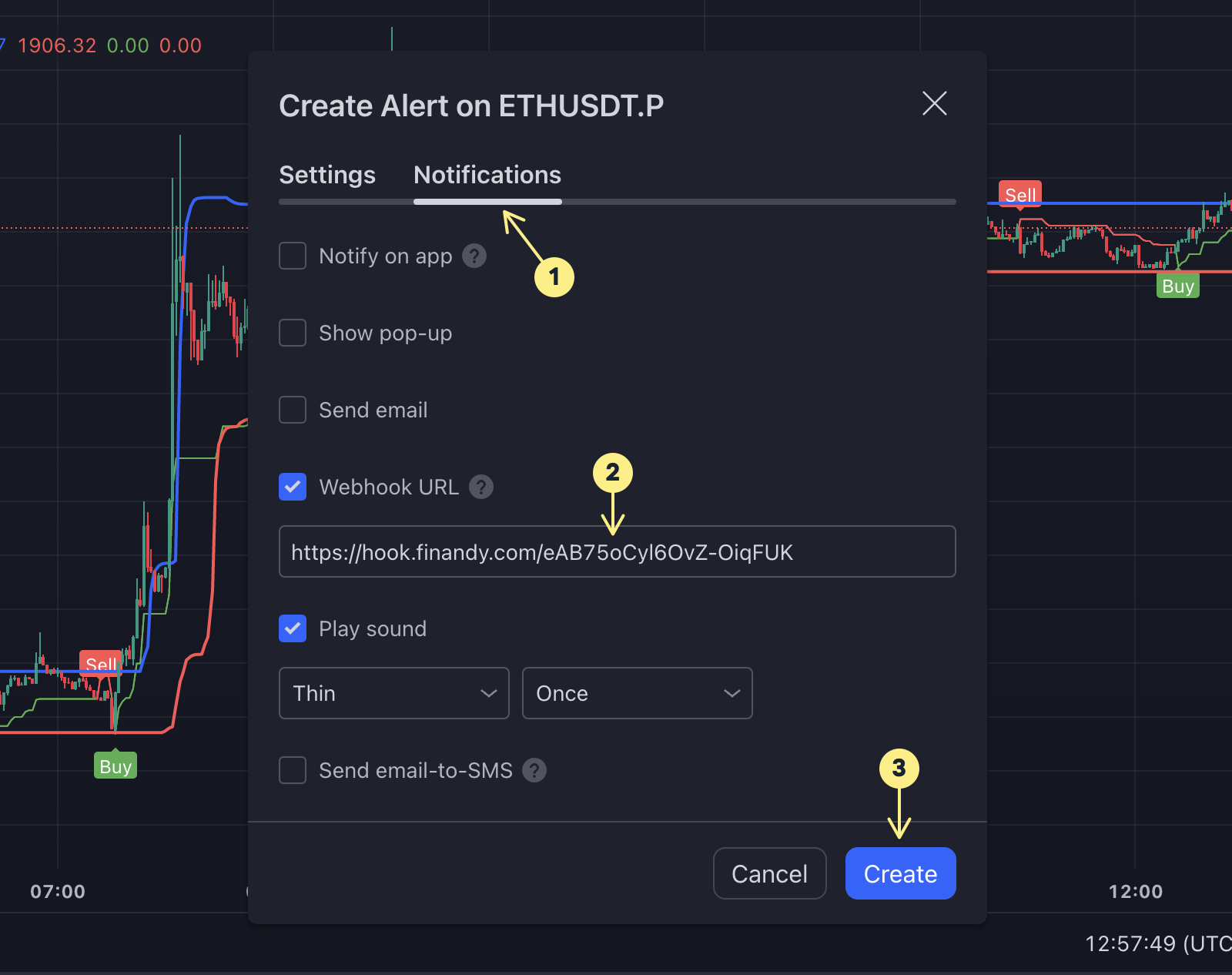 Переключитесь на таб "**Уведомлений**" (1), вставьте **URL** (2) из настроек Finandy и нажмите кнопку **Создания** сигнала (3).
