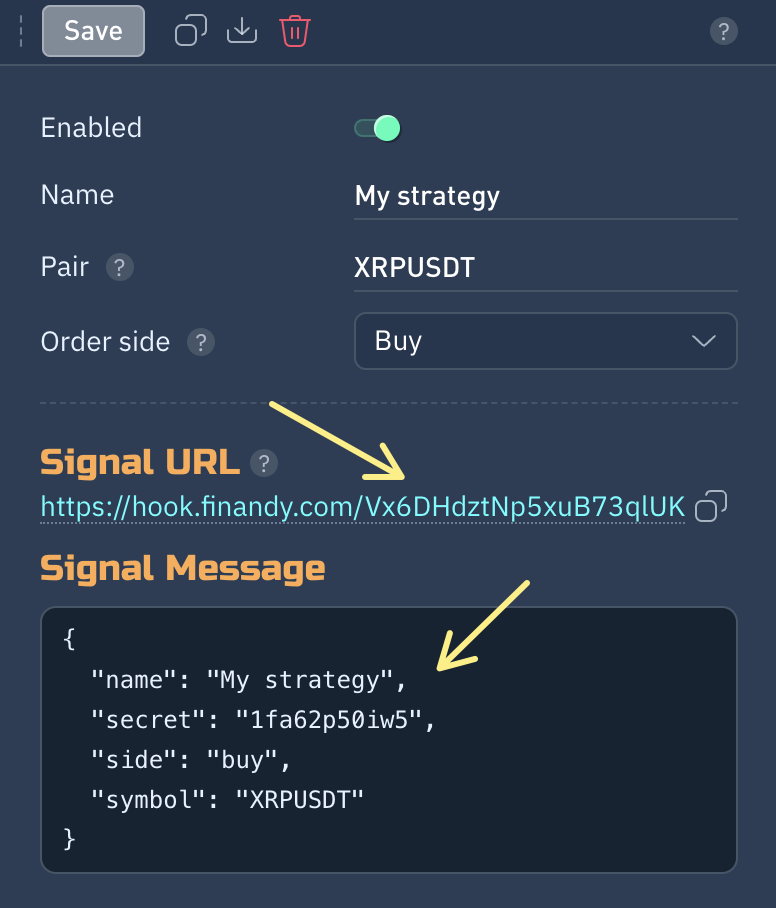 В **Finandy** достаточно создать только **1 подключение** и оно будет принимать сигналы на покупку, а также на продажу и создавать соответствующие ордера на бирже. Ниже приводится наглядная инструкция как подключить индикатор или стратегию TradingView к Finandy и торговать в автоматическом режиме на бирже Binance или бирже Finandy.