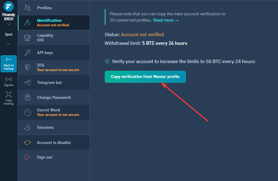 Обращаем ваше внимание, что вы можете скопировать до **20** раз верификацию главного аккаунта в подключенные профили. То есть на 1 верифицированную личность вы можете подключить до **20** аккаунтов на бирже Finandy на каждой ликвидности.