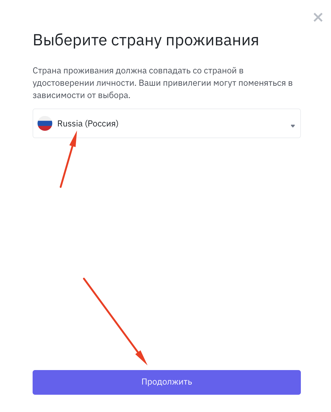 3\. Во всплывающем окне выберите страну проживания и нажмите продолжить.