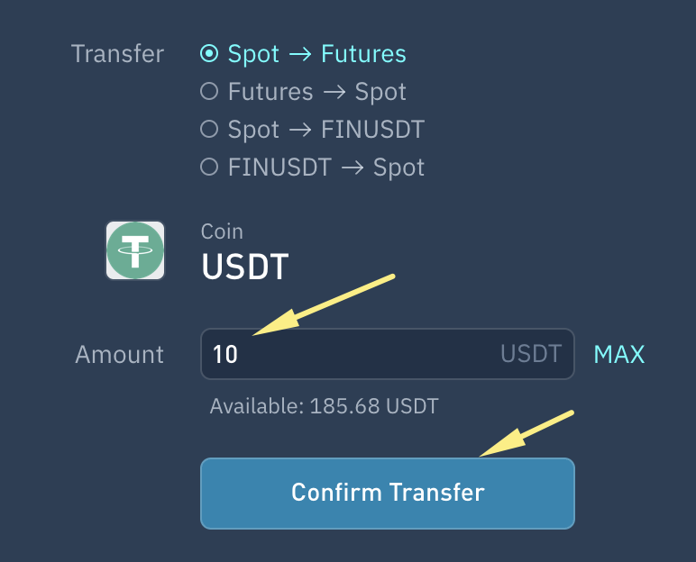 Перевод совершается аналогично тому, что описано выше, только направление выбирается **Futures → Spot.**