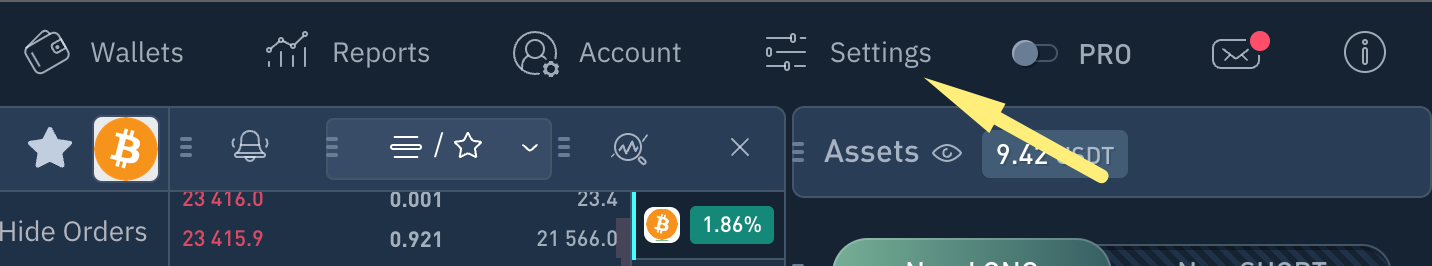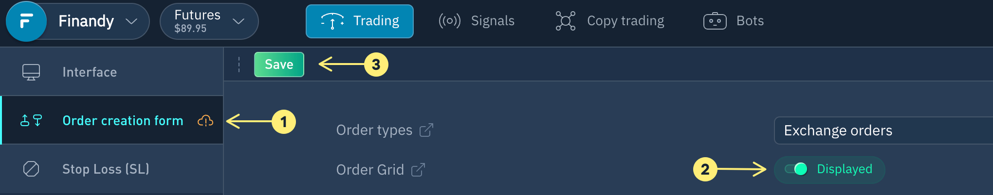 Для того чтобы включить отображение функционала сеток в стандартной версии интерфейса, перейдите в раздел "Настройки" и выберите "Создание ордеров" (1).
