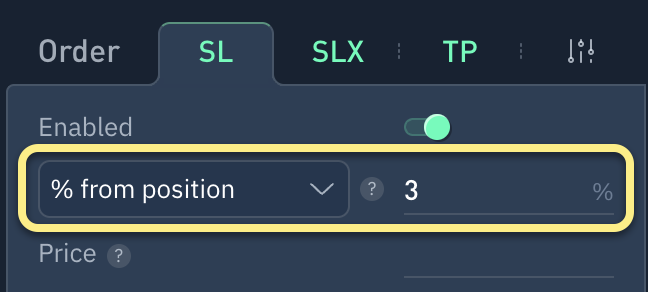 Hide or show Stop Loss Price Calculation in %' in the trading interface. When disabled, the calculation will be based on the position price.