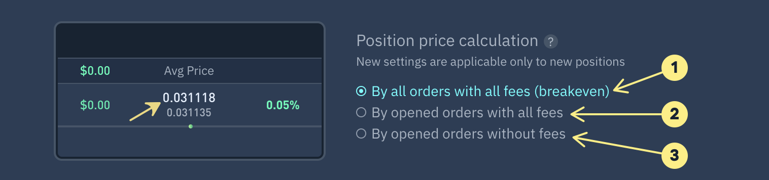 ## 1. Position price calculation based on all executed orders, taking into account fees (breakeven)