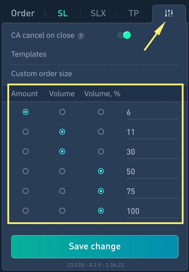 1. Tokens amount (contracts) 2. Volume 3. Volume in % (volume in percentage of free balance) 4. Selected option value